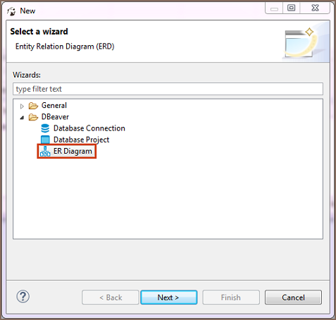 - On the Team Edition main menu, click File -> New. Then in the new diagram wizard, click DBeaver -> ER Diagram, and then Next: