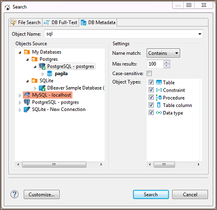 Now you need to choose the database connection against which to run the search. You only need to select the database connection(s) in the Objects Source field. In the Object Types field, you can select the database objects among which Team Edition will run the metadata search – select or clear the checkboxes. You can specify that the object name starts with, contains or is similar to the search combination (Name match field). You can also set the maximum number of results to display (Max results field) and apply Case-sensitive search.