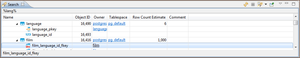Double-clicking a row in the Search view opens the respective object in a dedicated Database Object editor.