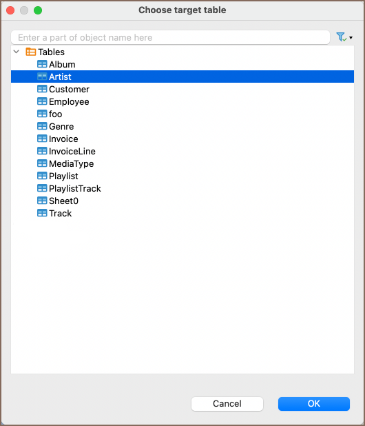 - Browse: Opens the Choose Target Table window
