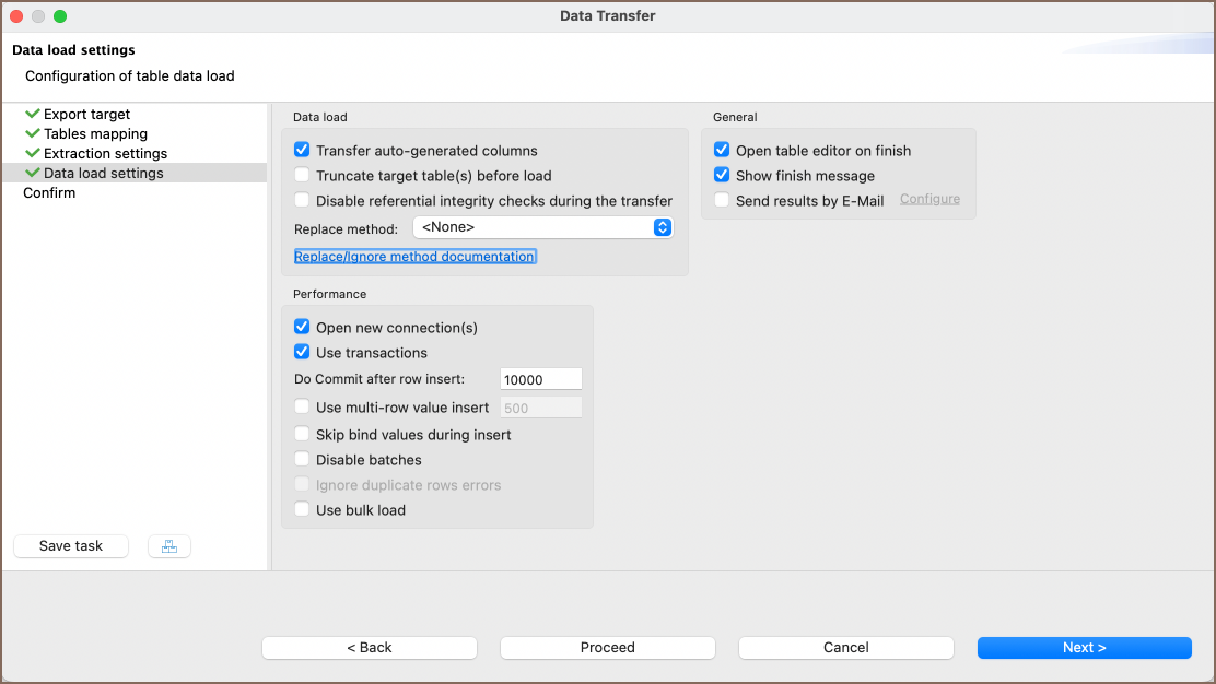 After configuring the extraction settings, you'll need to specify how the data will be loaded into the target database. The Data load settings tab provides a range of options to control this part of the process. Adjust the settings according to your needs and then press Next.