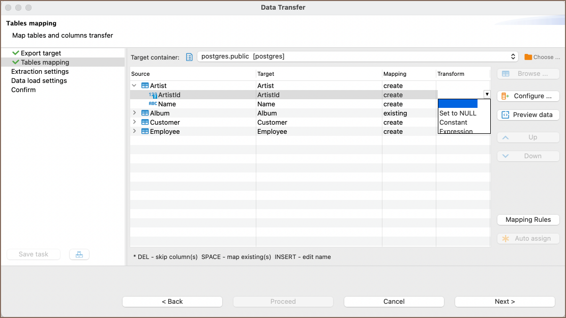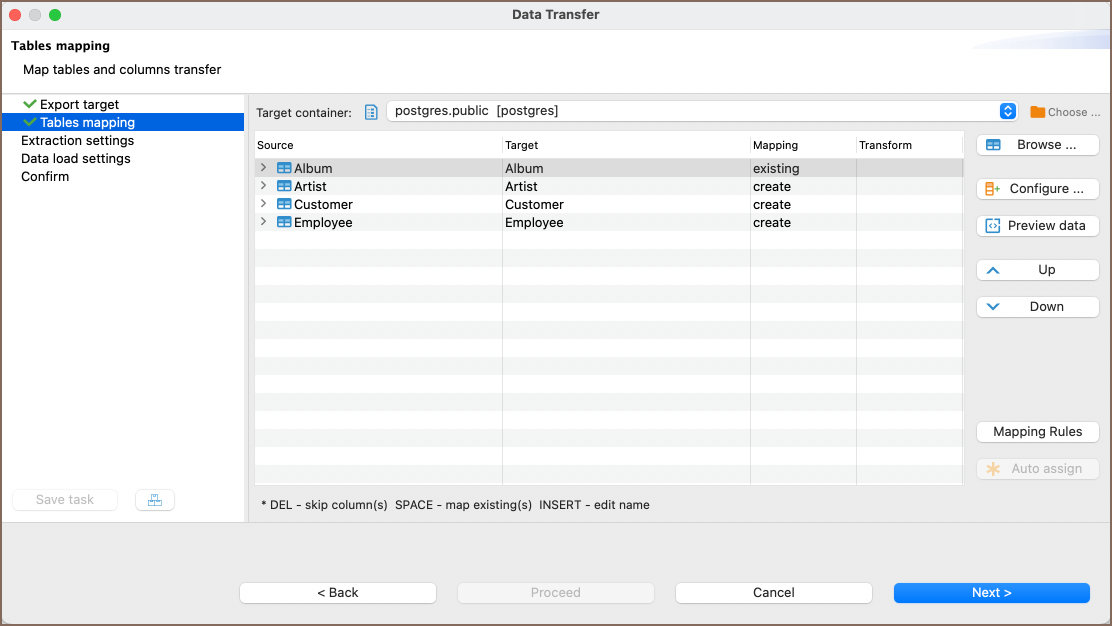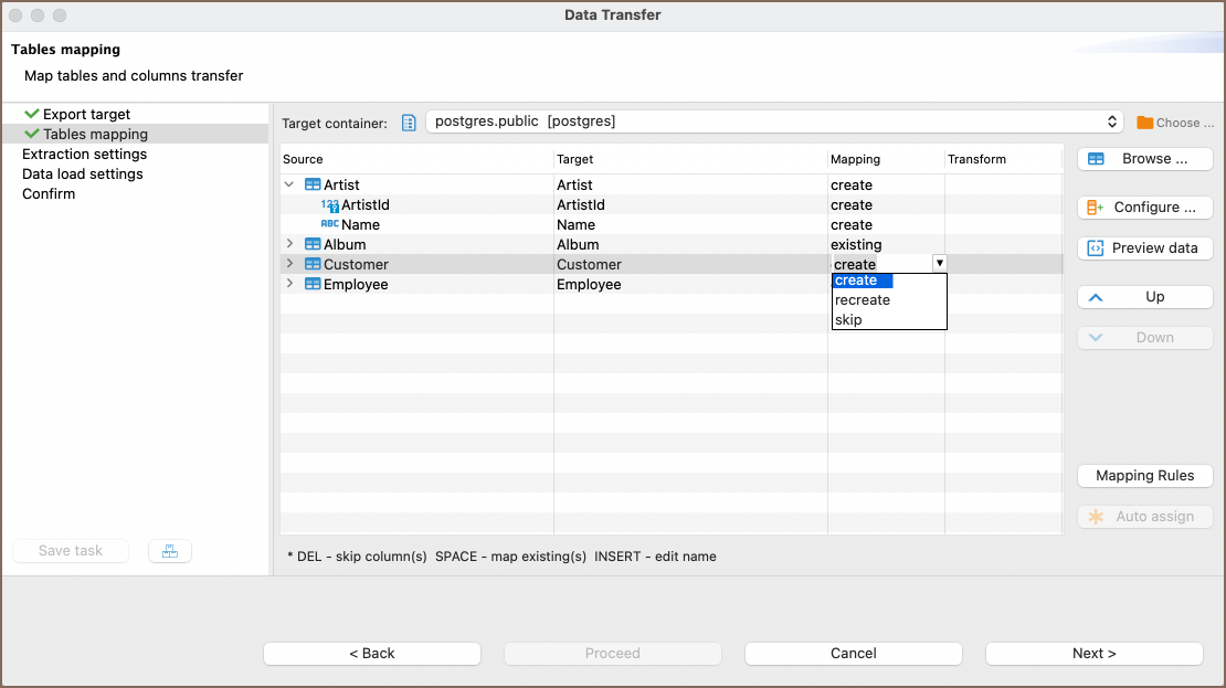 - Skip: Skips the data transfer for this table.