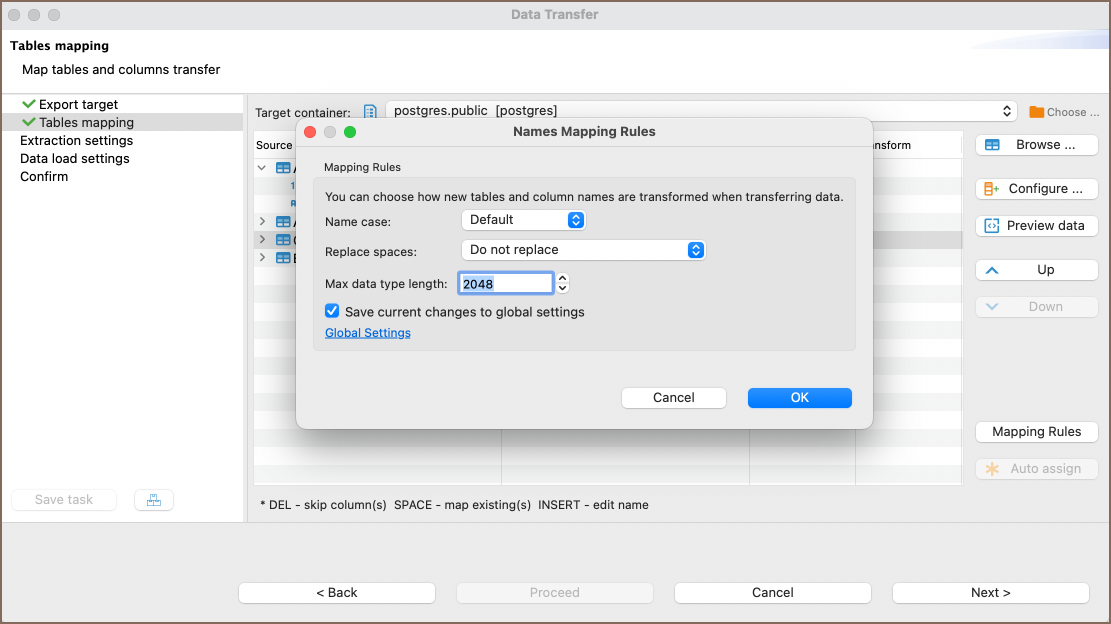 Clicking the Mapping Rules button opens a window that provides options for customizing how new tables and column names are transformed during the data transfer.