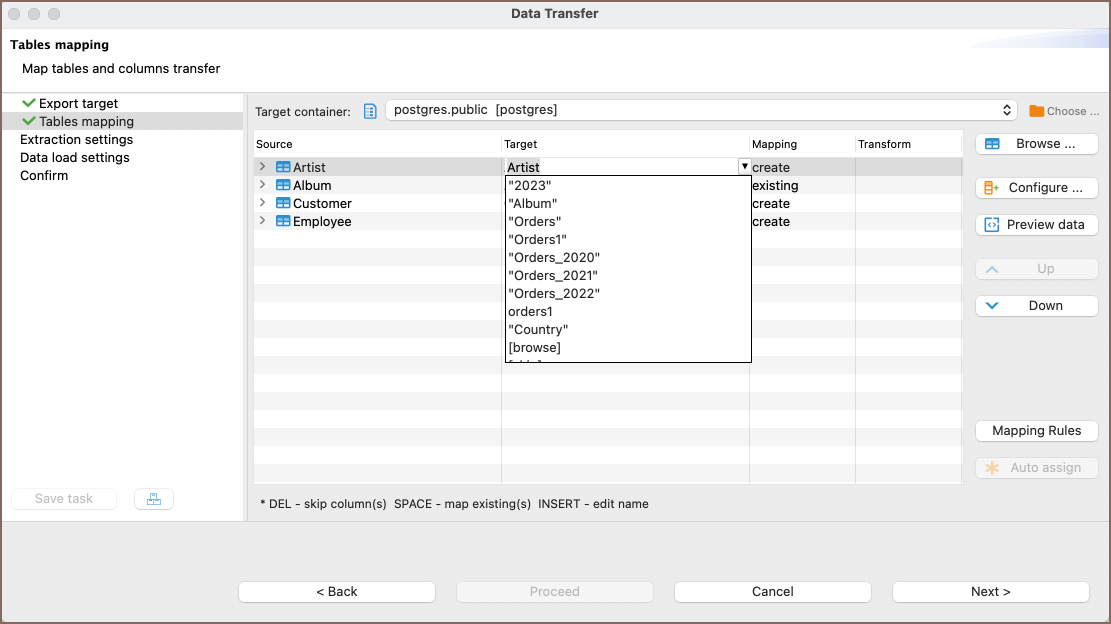 To change the mapping type, click a cell in the Mapping column of Table mapping dialog box and select the required mapping type.