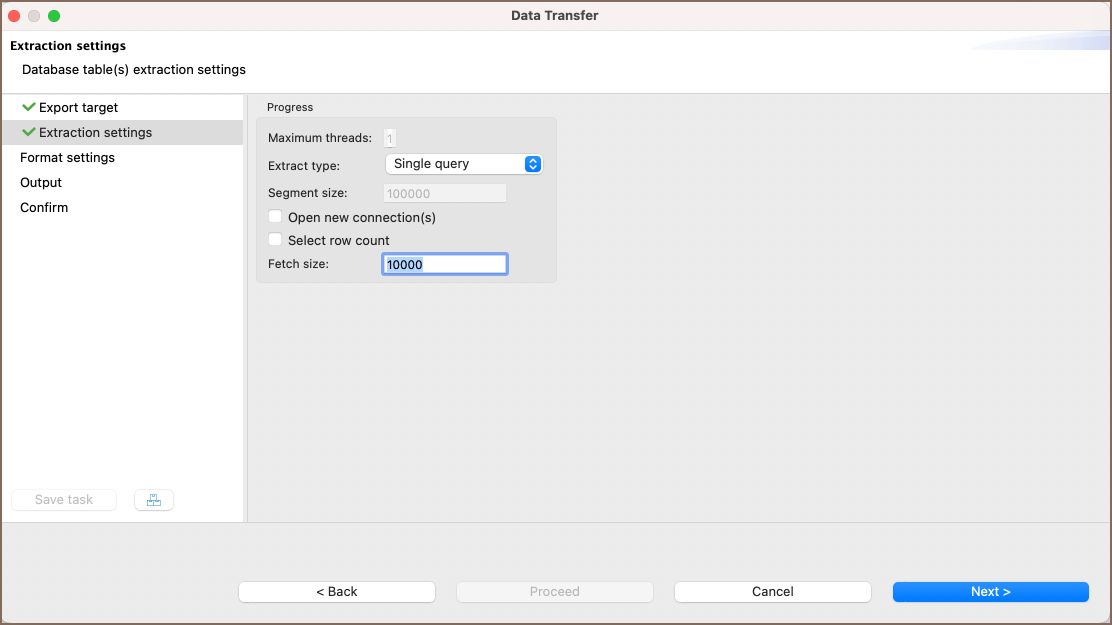 - Set your data extraction options (how the data will be read from the tables). This may affect the extraction's performance. And set the export format option. They are specific to the data format you chose in step 2: