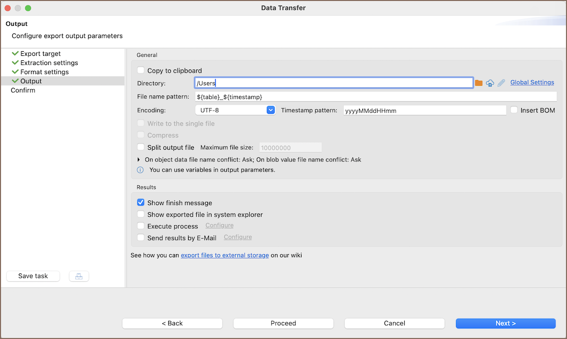 - Review what you want to format and which format you will export. You can also save all your settings as a task in this step or change the task variables: