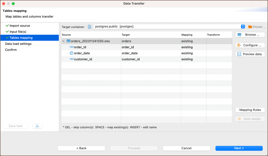 - In the next window, set XLSX-to-table mappings. Please refer to our mapping process guide for more detailed information.