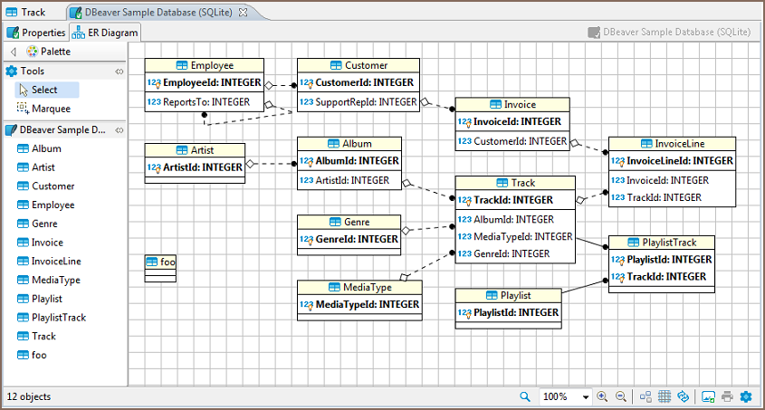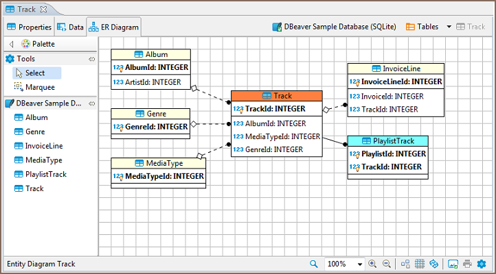 The ER diagram for a table shows the table itself and its relations with other tables inside the schema. To view the ER diagram for a table or view, double-click the table or view in the Database Navigator and then, in the Database Object Editor, switch to the ER Diagram tab: