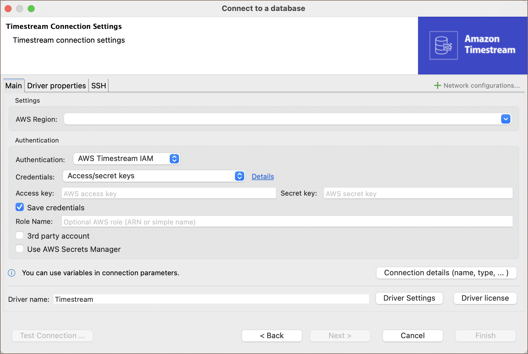 | Driver Settings | If there are any specific driver settings, configure them here. For a detailed guide on driver properties, please refer to the official AWS Timestream documentation. |