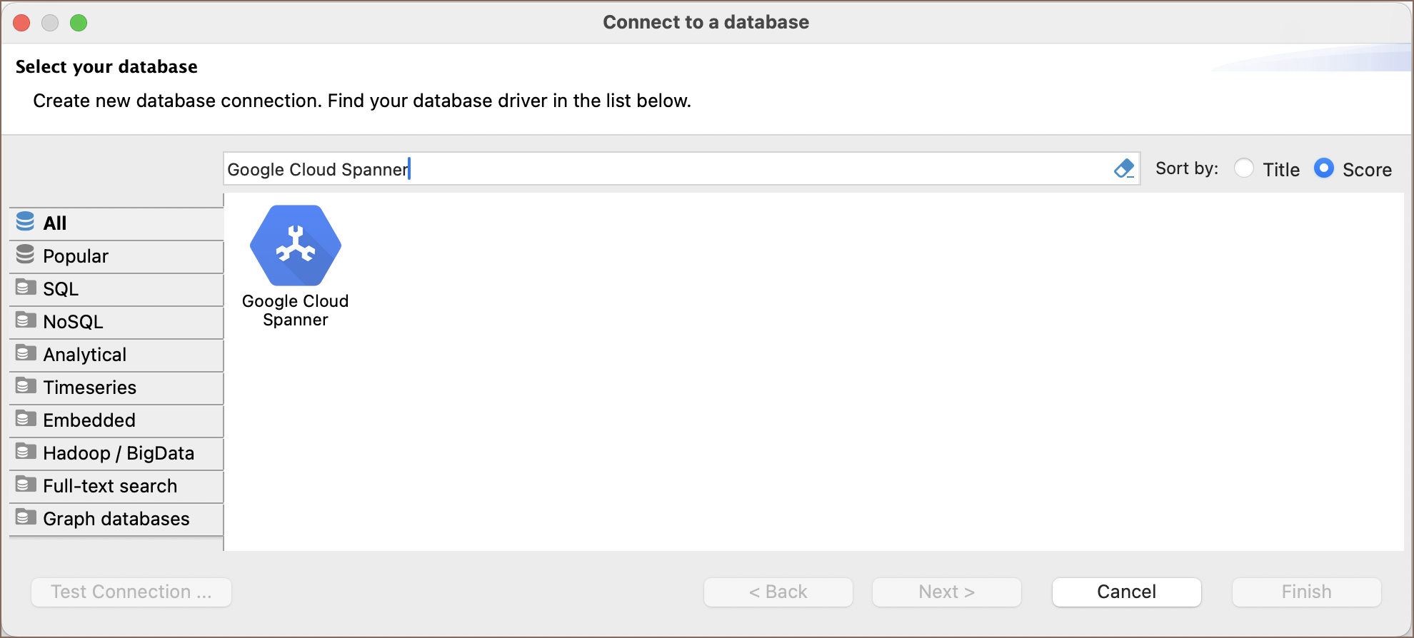selecting the Google Cloud Spanner option to connect to your database. If you have not yet created a