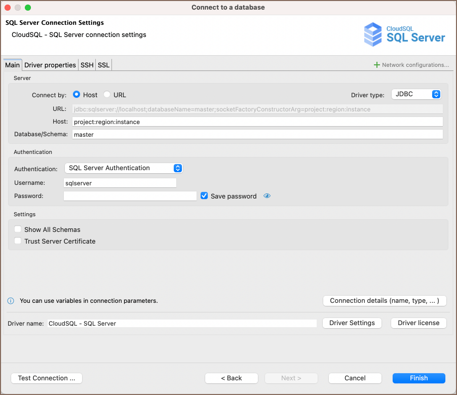 | Driver Type | Select the appropriate driver for your Google Cloud SQL Server database. |