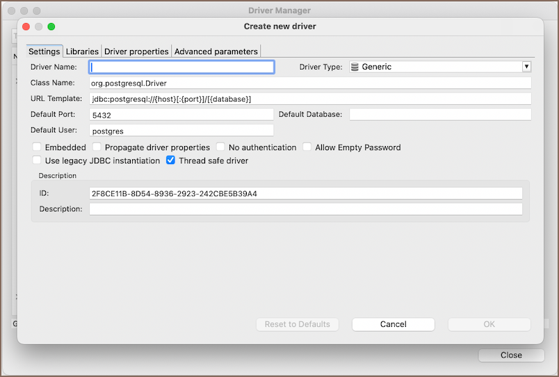 The Generic driver allows you to connect to databases that do not have a predefined JDBC driver. It works with any database that supports JDBC, giving you control to manually load the required JDBC library.