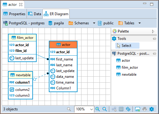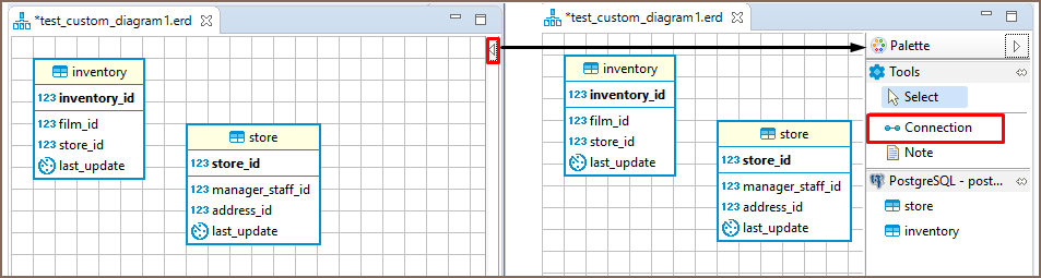 * (Available for Custom Diagrams only) - connect tables with a connector: click the Show Palette button (