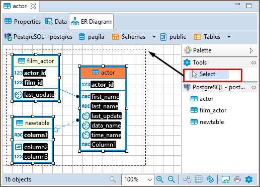 - Select – supports both, single and multi-select modes. To select a single element (table, connection, entity inside a table) in a diagram, just click that element. To select multiple elements, similar to using the Marquee tool, click outside the first element and draw until all elements you need are in focus: