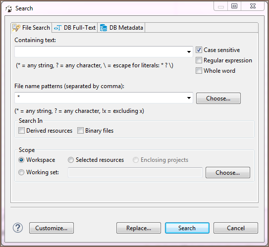 The toolbar of the Search view for File search provides more tools in addition to those available for all search types: