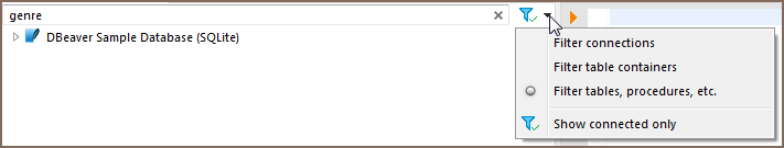 In the Database Navigator and Database Object Editor you can filter database objects to include or exclude some of them from the view. You can filter connections, schemas, tables, views, and procedures. A dots sign (...) next to the node`s name indicates that a filter is applied to its sub-nodes: