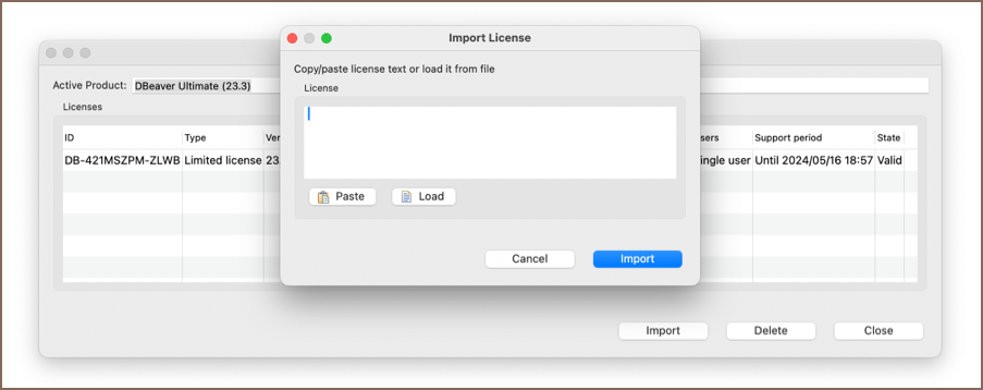 If you copied the License Key to the clipboard, press the Paste button and then Import. If you downloaded a .txt file with the License Key, press the Load button and then select the file from Downloads. The License Key will be pasted automatically. Then press the Import button and your license will be added to the License Manager. You have successfully imported your license.