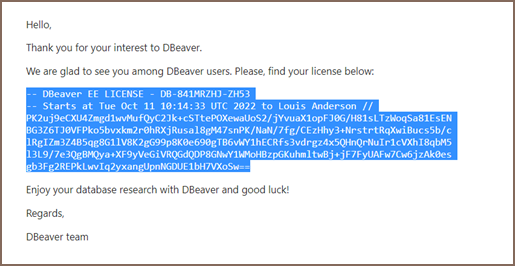 After purchasing the Team Edition license or getting the Trial/Academic license, you will receive a License text by email. It will also be available in your personal account on our site. This License text will contain your License ID e. g. DB-841MRZHY-ZH54, the start date and license owner’s name and company name. It is very important to import your License correctly.