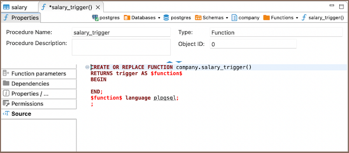 Creating a trigger is a process that mirrors the creation of a function. Once your function is defined, you can move on to create the trigger. This can be done through the Properties Editor or the Database Navigator.