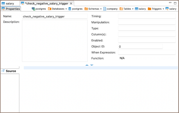 Next, you need to provide a name for the trigger and specify the function that it should call when it's activated. The trigger's function is typically written to perform a specific task when certain conditions are met. For example, if you've written a function to check if a new salary value is negative, you can create a trigger that calls this function before any