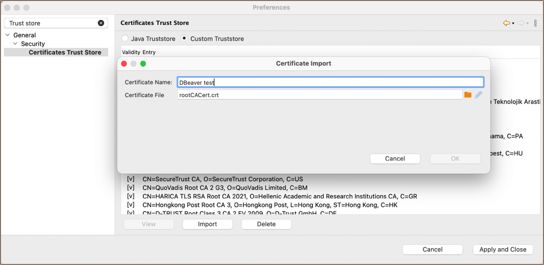 You can manage trust store settings in Team Edition to enable secured driver downloads and establish SSL connections. This is achieved by adding or removing certificates from the Custom Truststore. Certificates are integral to establishing secure connections, allowing necessary driver files to be downloaded, and enabling SSL connections to databases. Without the appropriate certificates, you might encounter an error message.