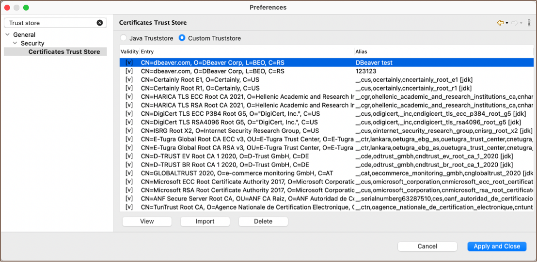 In the Custom Truststore section, select the certificate and click the View button to see detailed information about the certificate. If you need to remove a certificate from the trust store, select the appropriate certificate and click the Delete button.