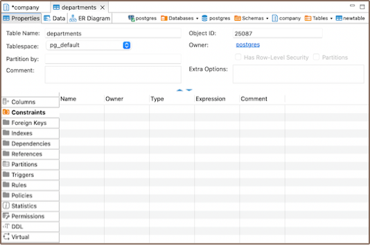 There are also various ways to create a table: from the Properties editor and from the ER diagram.