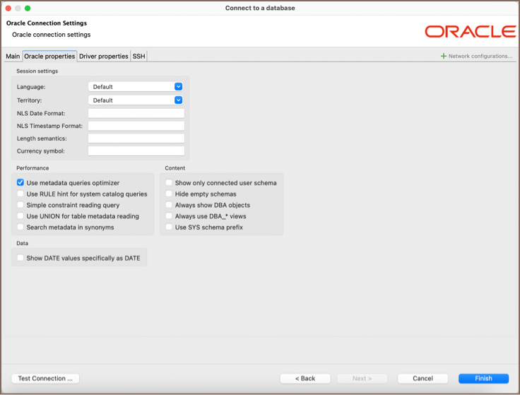 - The second page of the connection settings offers additional options that allow you to customize your further connection to the Oracle database.