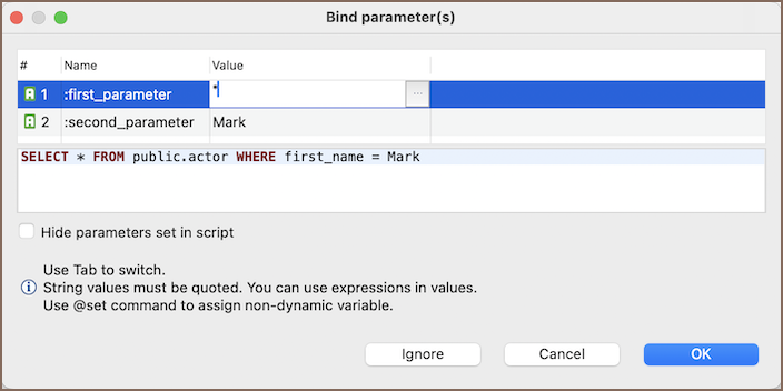Upon every execution of the parameterized query, Team Edition brings up the Bind parameter(s) window.