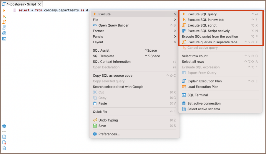 To execute a query under the cursor or selected text, press Ctrl+Enter or right-click the query and click Execute -> Execute SQL Statement on the context menu. You can do the same using the main toolbar or main menu: SQL Editor -> Execute SQL Statement. This executes the SQL query under the cursor or selected text and fills the results pane with the query results.