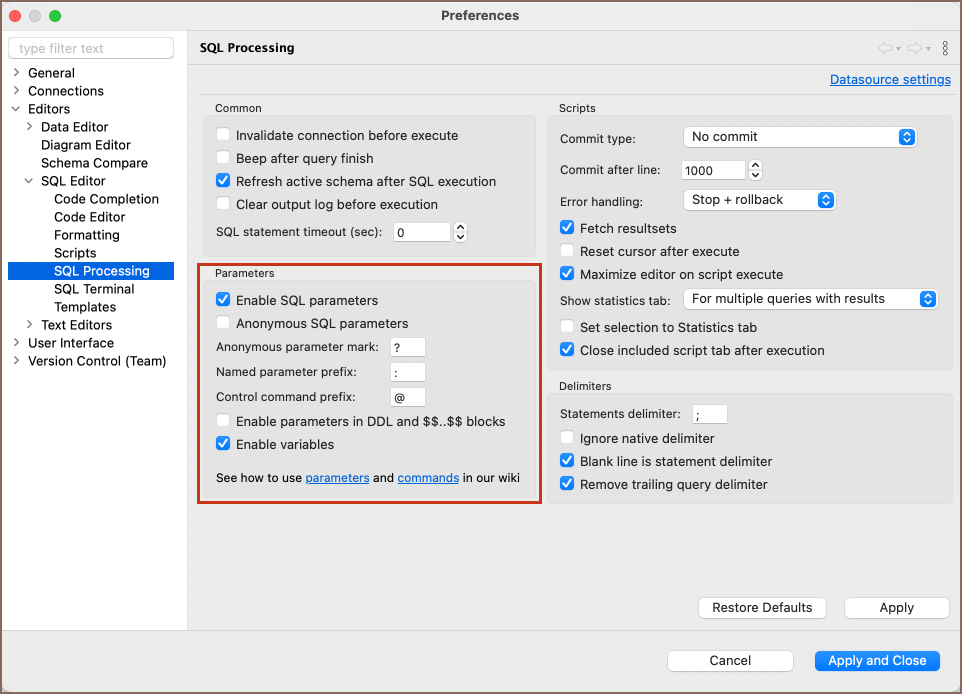 To customize parameter and variable behavior in Team Edition, access the settings through Window -> Preferences -> Editors -> SQL Editor -> SQL Processing.