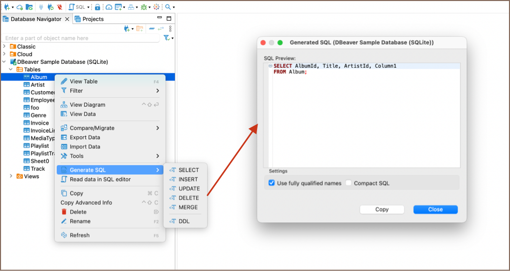 • The generated SQL statement will appear in a new window for you to review and copy.