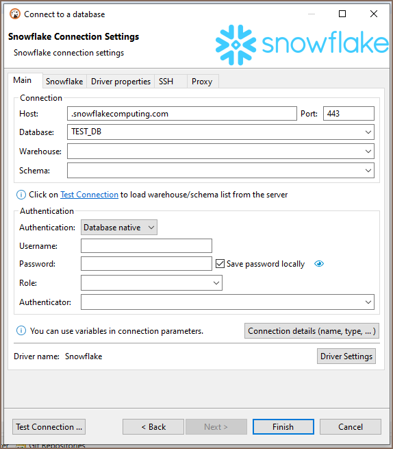 *Click on the "Test Connection" button to load the warehouse/database/schema list from the server.