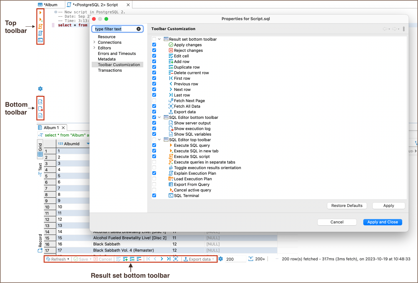 Within the customization menu, you can tailor the Result set bottom toolbar to fit your workflow. This section allows you to alter the tools for interacting with the displayed data sets.