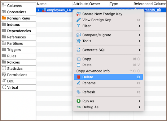 • Using the Properties Editor: Open the Properties Editor, navigate to the Foreign Keys tab of the corresponding table, and find the foreign key you want to delete.
