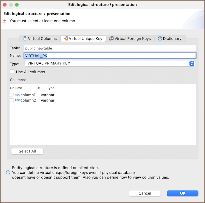 | Use All Columns | Check this to include all columns from the table in the virtual unique key. |