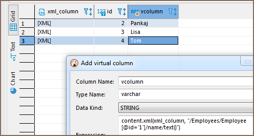 Use content.xml(columnName, "expression") or content.xml(columnName, "returnType", "expression") patterns to create expression for XML column. The quotation is important for parsing processes. XML expression can return types: string, number, boolean, node, nodeset - all these types can be used (!in quotes) for return data type clarification. content.xml(columnName, "expression") returns string by default