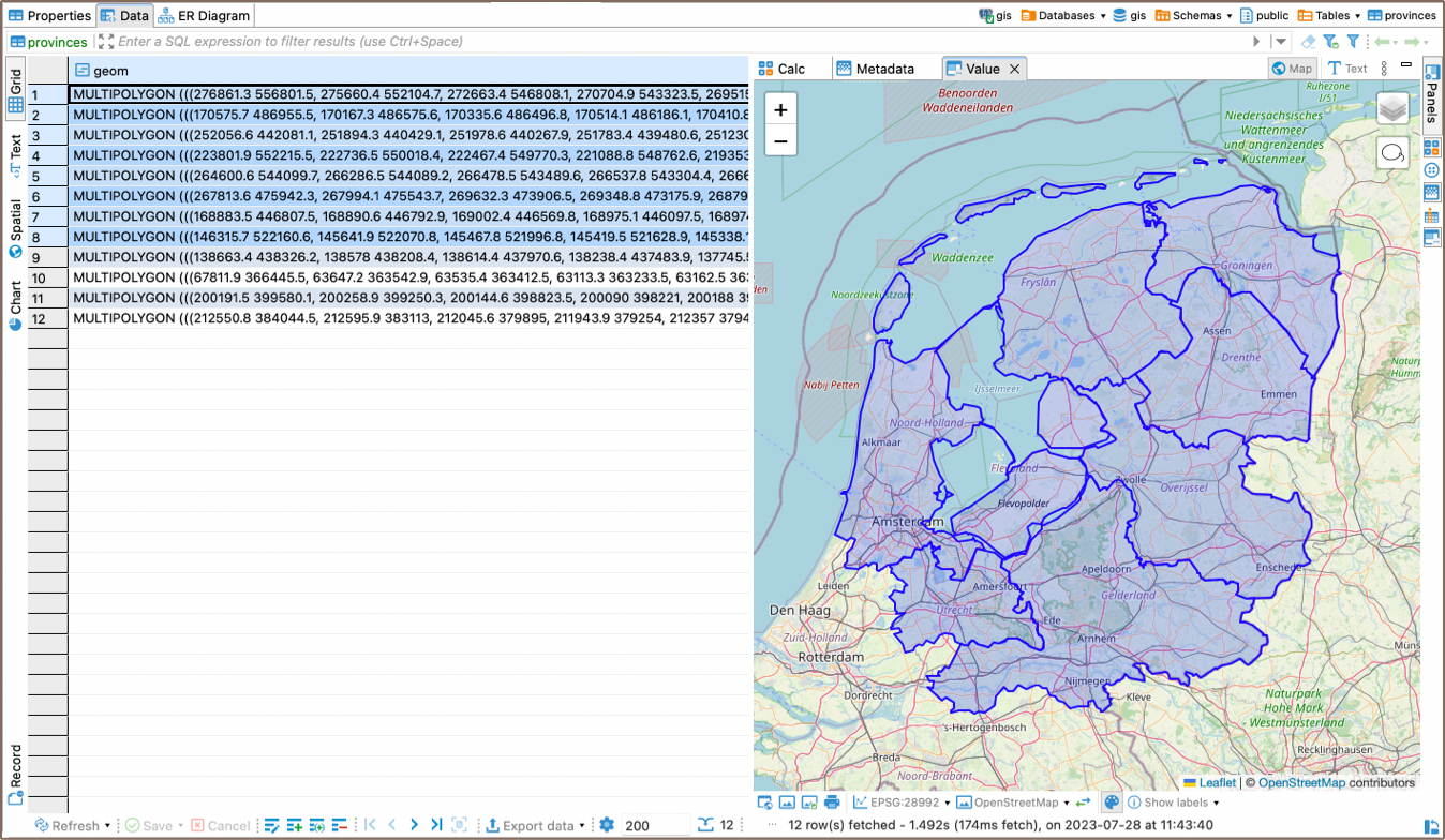 In Team Edition, you can visualize your geodata on the map, regardless of whether it is stored as string or binary data. To do this, select the data cell and navigate to the View/Format setting. From there, choose the Set columnName format option and select Geometry from the available formats.