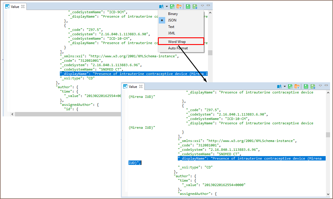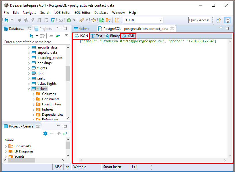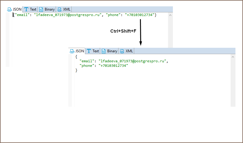 To open the full-size XML/JSON editor click the cell containing data in XML/JSON format and press Shift+Enter.