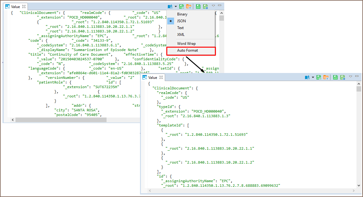 Use Auto Format feature to automatically change the appearance of XML/JSON script (fix spaces around operators / commas, fix indentation, etc) and make it more readable.