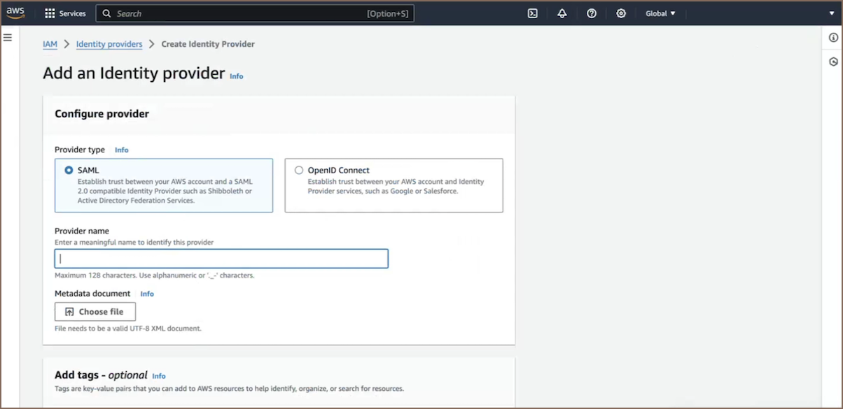 Add Identity Provider in AWS IAM: