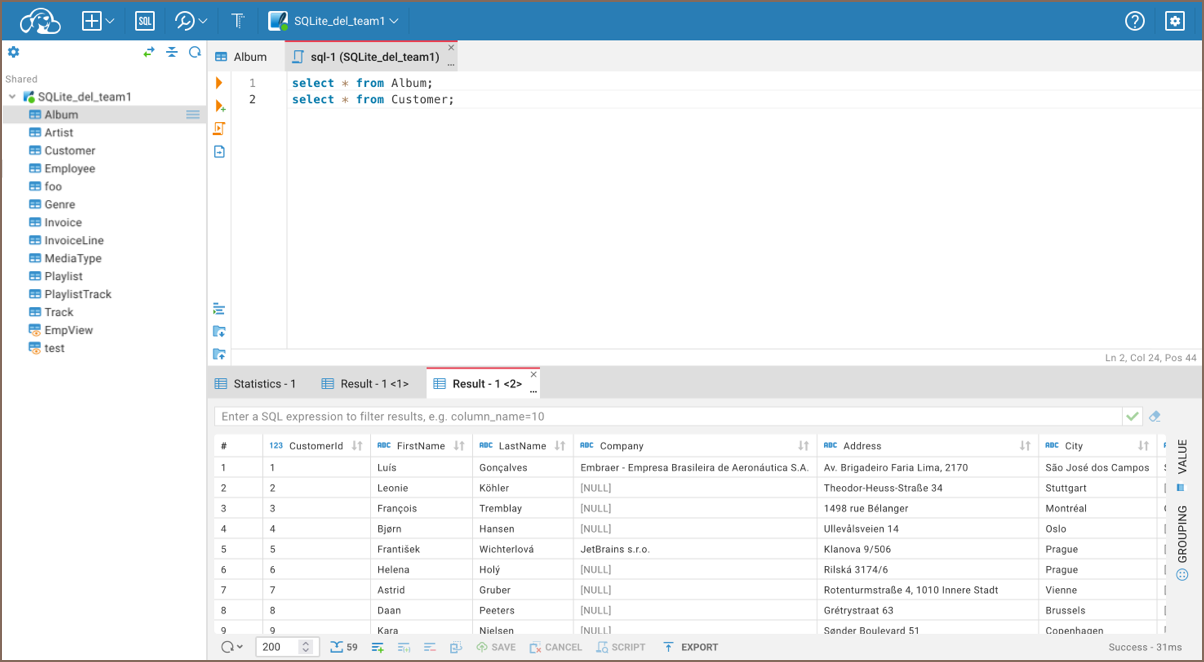 Click on the Execute SQL script icon in the left toolbar or use the Alt+X shortcut to execute the script. The summary result will be shown in the Statistics tab, and results will be shown in separate Result tabs.
