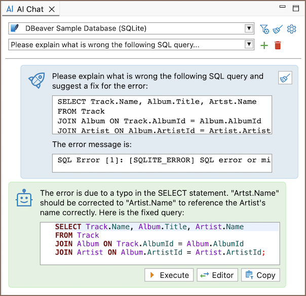 After running a query, if an error occurs, the Explain and Fix button appears below the error message in the Results panel.