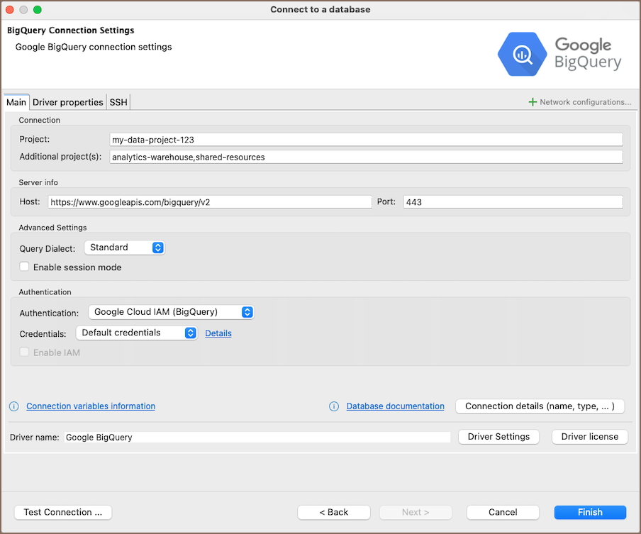 In this subsection, we will outline the settings for establishing a direct connection to a BigQuery database using Team Edition. Correctly configuring your connection ensures seamless interaction between Team Edition and your BigQuery database.