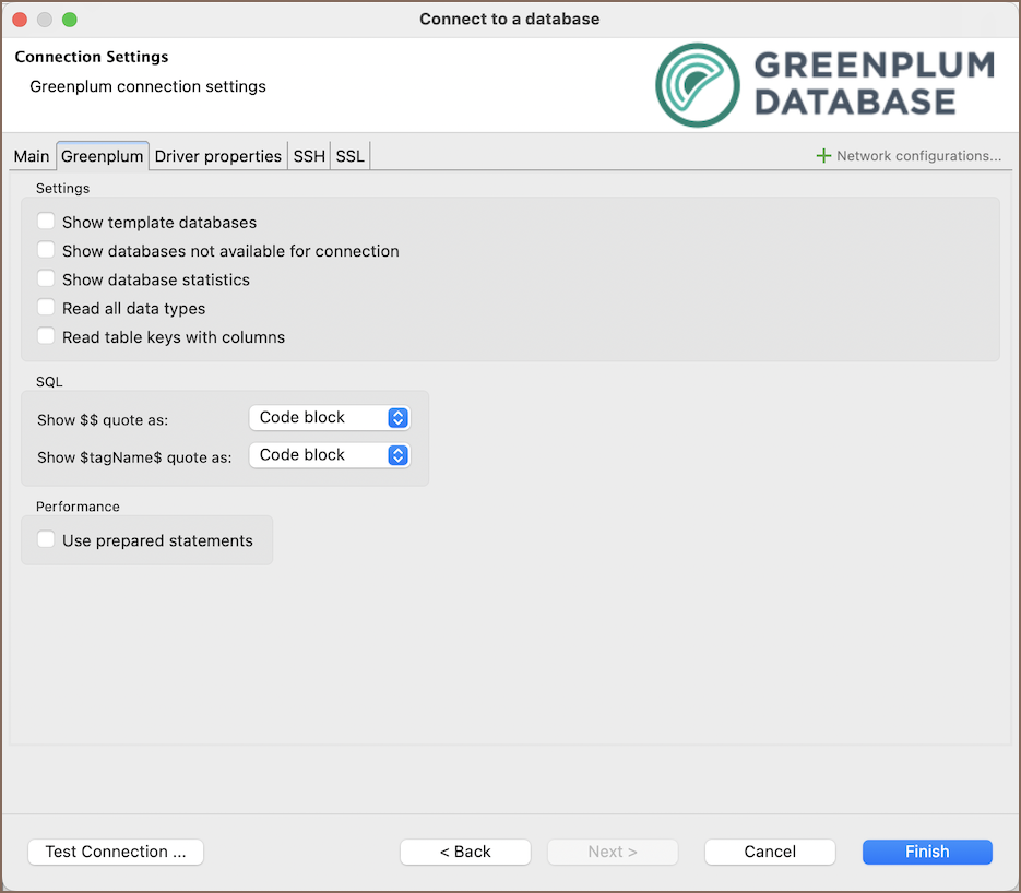 - The second page of the connection settings offers additional options that allow you to customize your further connection to the Greenplum database.