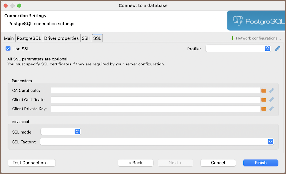 SSL parameters are optional and should only be specified if required by your server configuration.