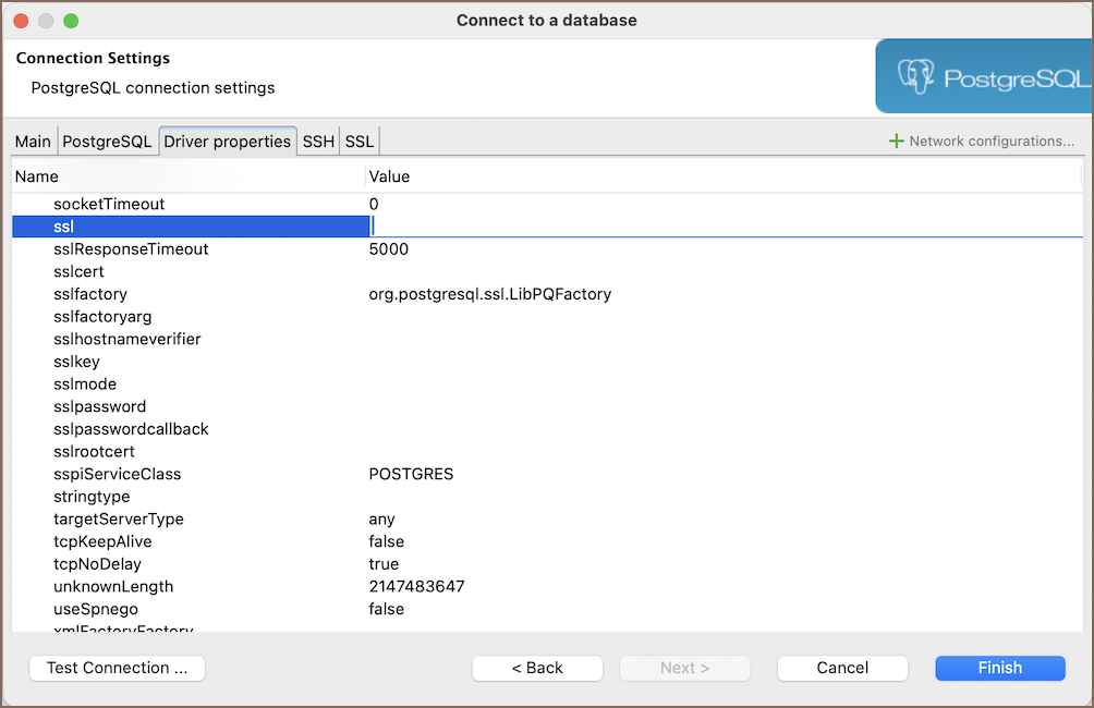 For some databases, an alternative method to configure SSL settings is available through the Driver properties tab. This approach allows access to additional or driver-specific SSL options that may not be present in the main SSL tab: