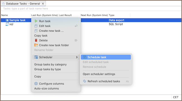 or from the main menu Window. Select a task that you want to schedule in the tasks view and open the context menu: