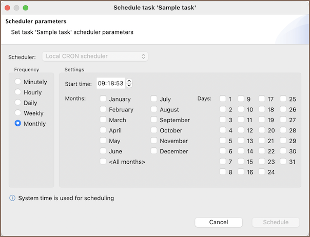 Team Edition will open the scheduler configuration dialog. You can configure task frequency, recurrence period and start time there: