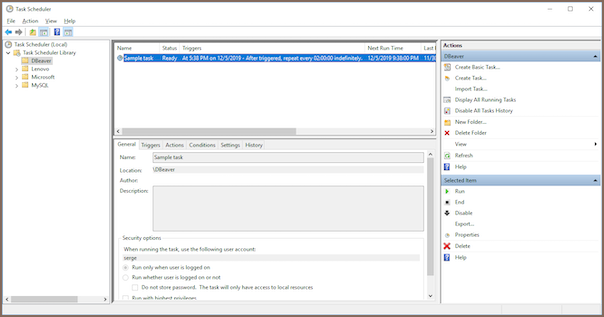 You can see and change the scheduled task details in the Windows Task Scheduler. Click on the Open scheduler settings command in the task view context menu: